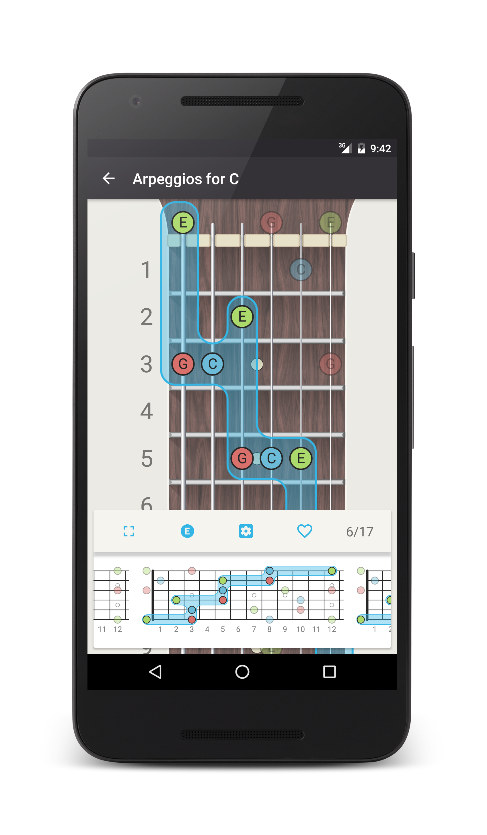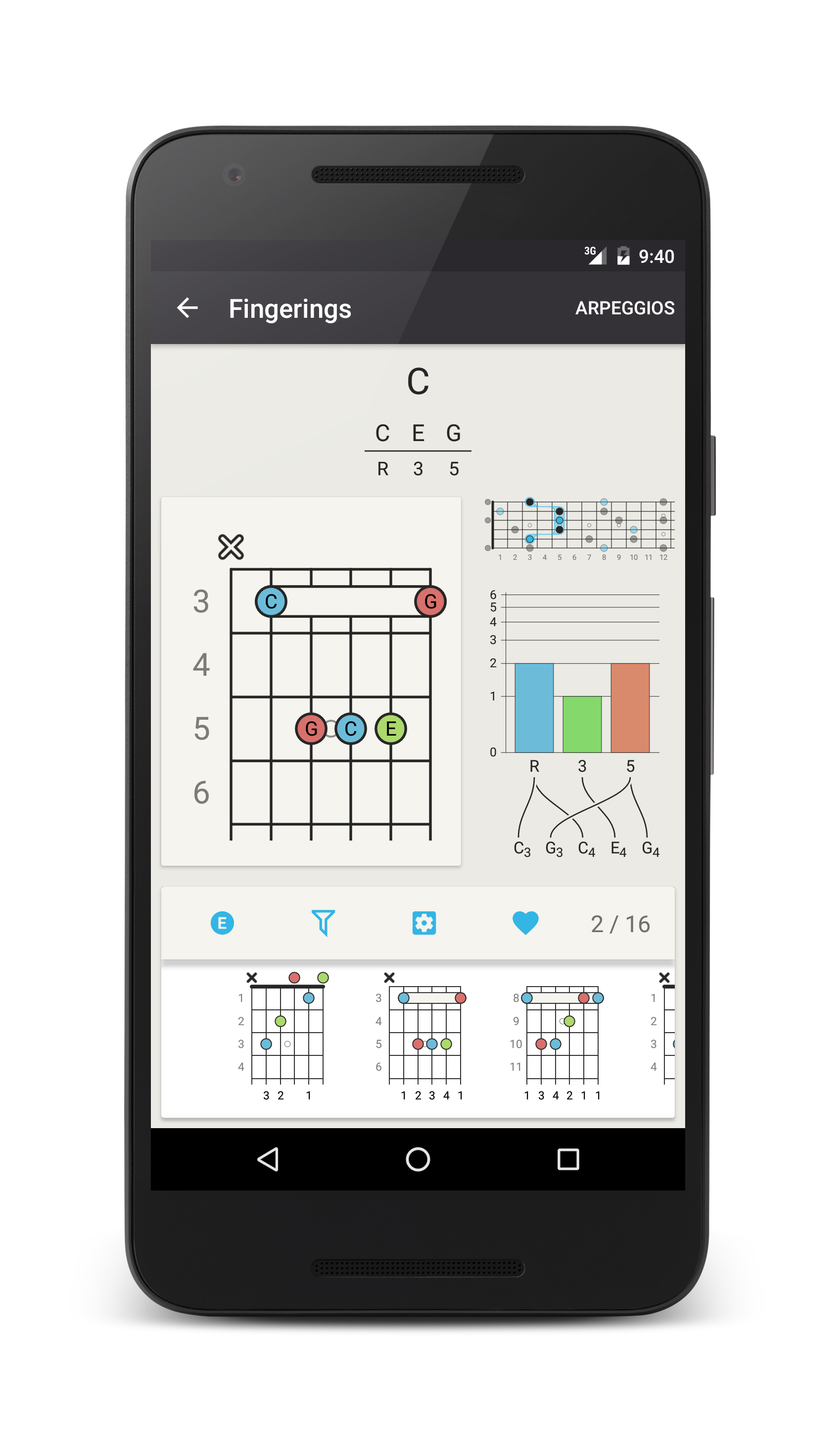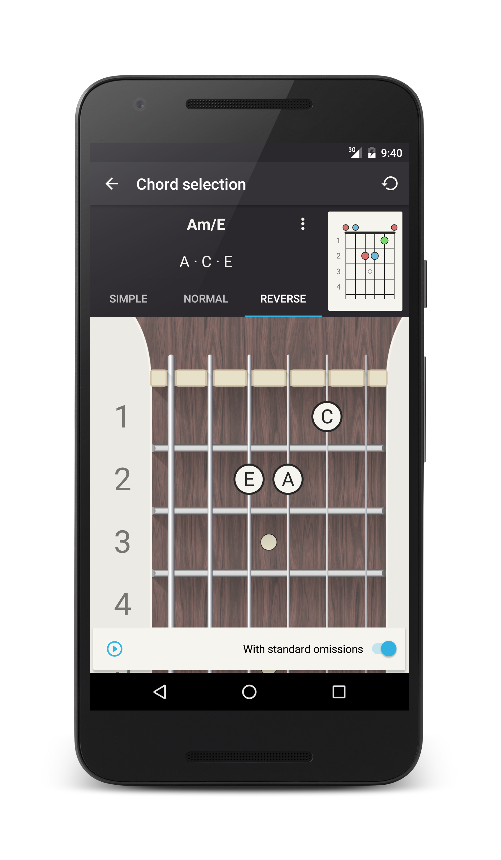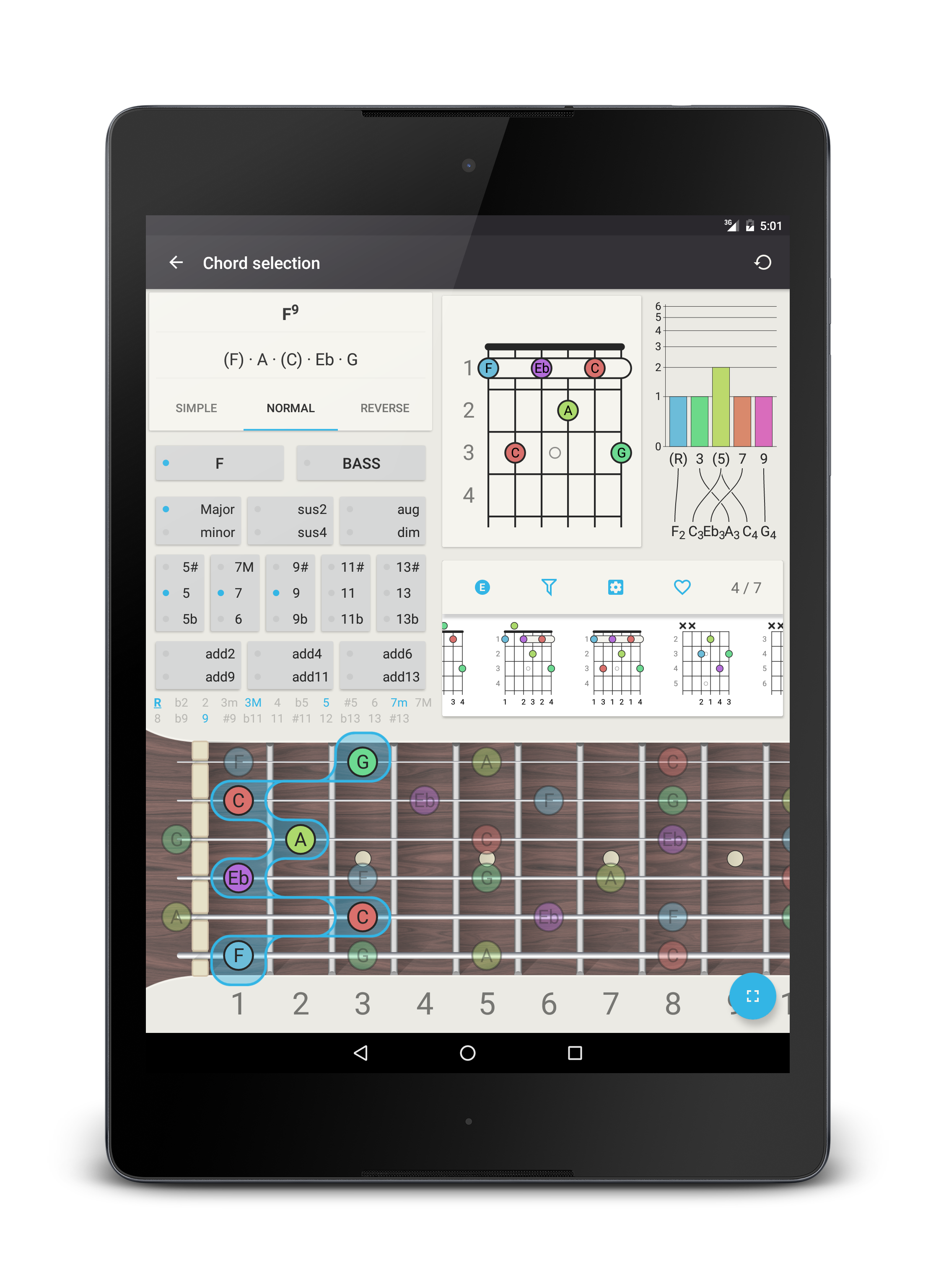 The app is also able to reverse search chords. In the reverse mode, you draw your fingering on the neck and the app gives you all the possibilities. A few remarks about this mode: if the “Allow usual omissions” setting is “On”, the app will automatically complete the chord for you. This can be overridden from the reverse search screen and if you switch it off, the app will only give you results corresponding exactly to the notes you have entered. For example, it will tell you that this fingering correspond to a C9(no5) if the 5th is not present, whereas it will tell C9 if the “Allow usual omissions” setting is “On” (the 5th is indeed dropped from 9th chords most of the time). If the fingering has two or three notes only, the app will also display all the possible ways to complete it to generate more complete or complex chords. Please also note that only notes specified on the neck are used to compute the chords. Strings without dots are considered muted. If the string is played open, simply mark it at the 0th fret, just behind the nut.