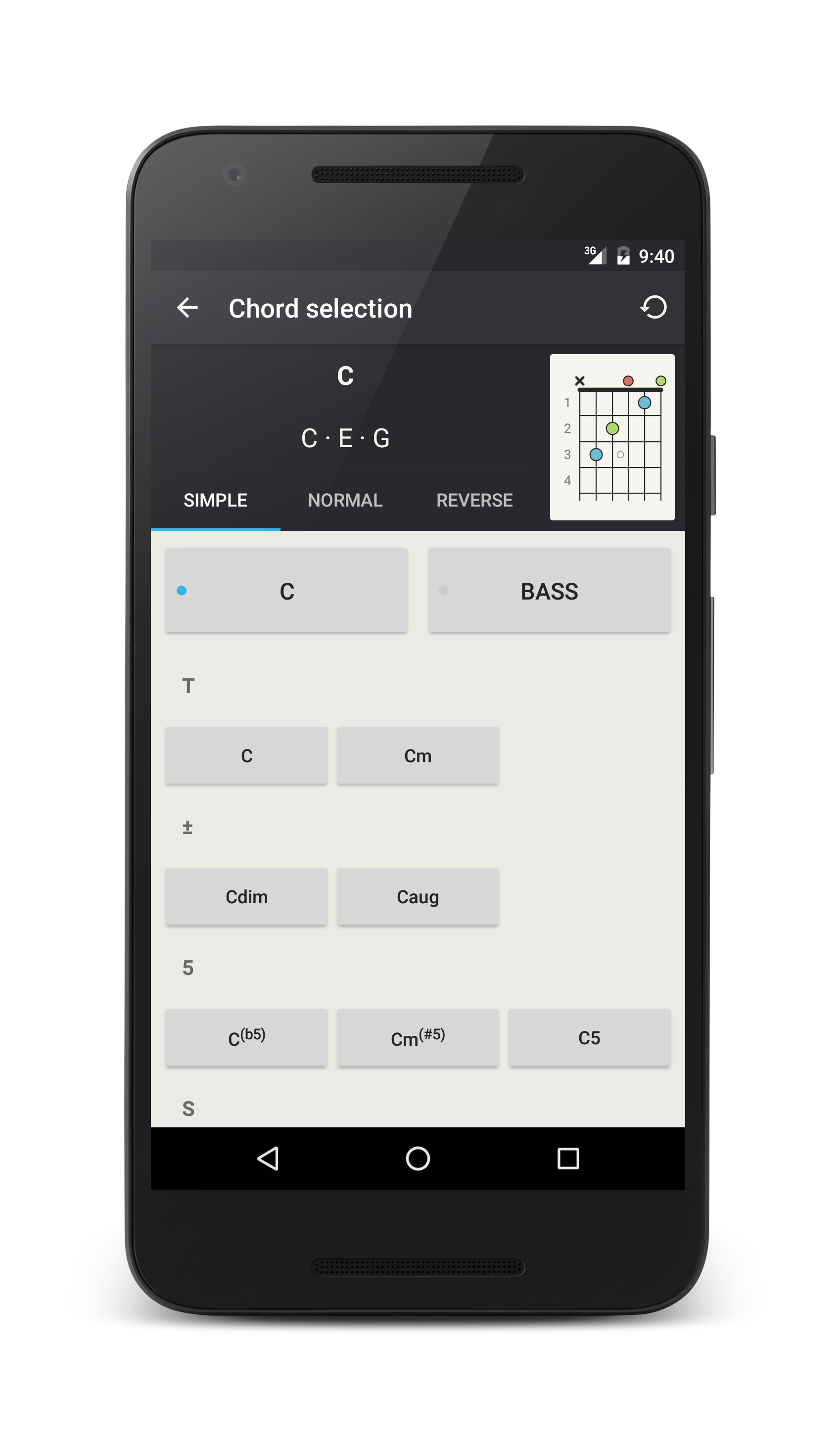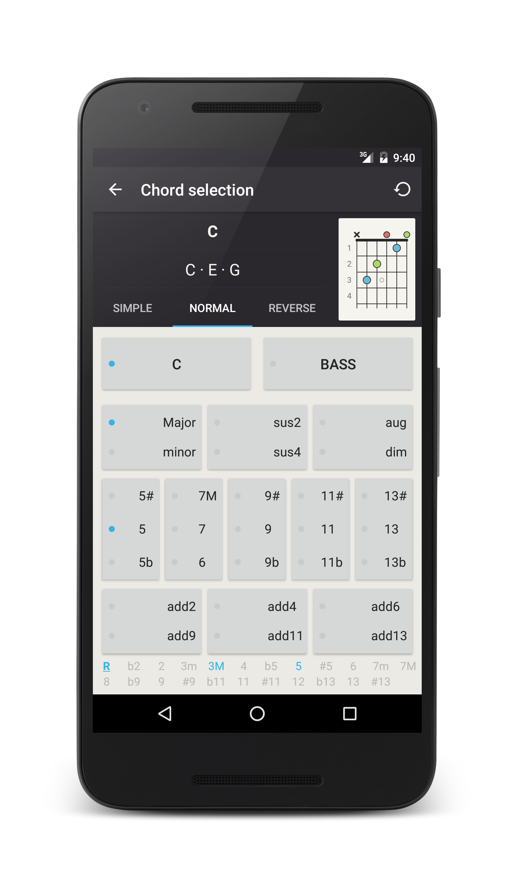 The principal way to enter chords is the normal mode. An intelligent keyboard is presented and you simply write the chord symbol with it. The keyboard responds and adapts itself so even if you don’t know music theory, simply matching parts of the symbol with it allows to create the chord. The root, and optionally the bass like F# in D/F#, can be selected at the top of the keyboard. As you enter the chord, the formula is updated and you can have a glance at the intervals involved. If you are a beginner, you can also use the simple mode. In this mode, about 50 common chords are already formed and ready to use. You just have to specify the root (and eventually a bass for slash chords).