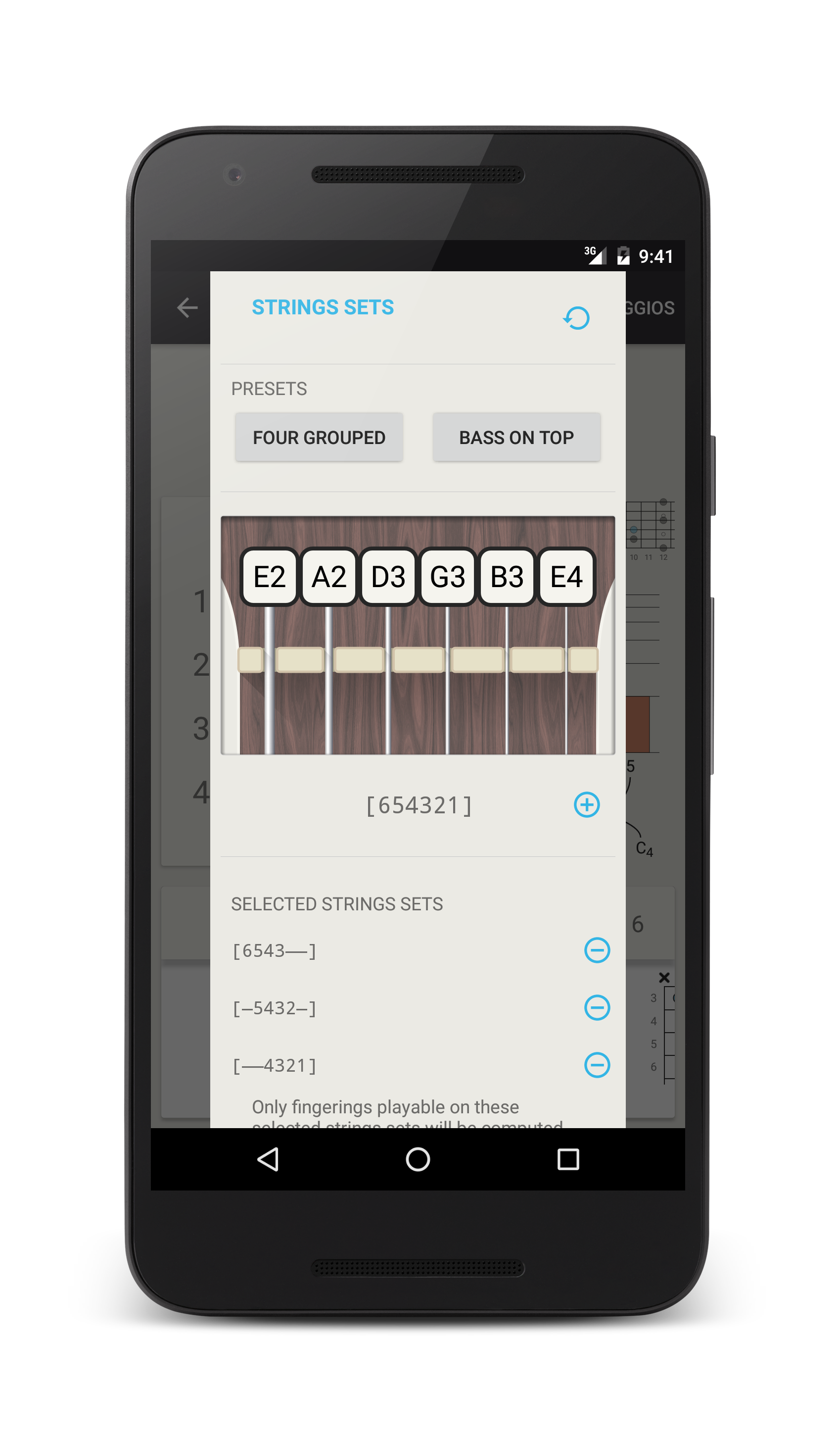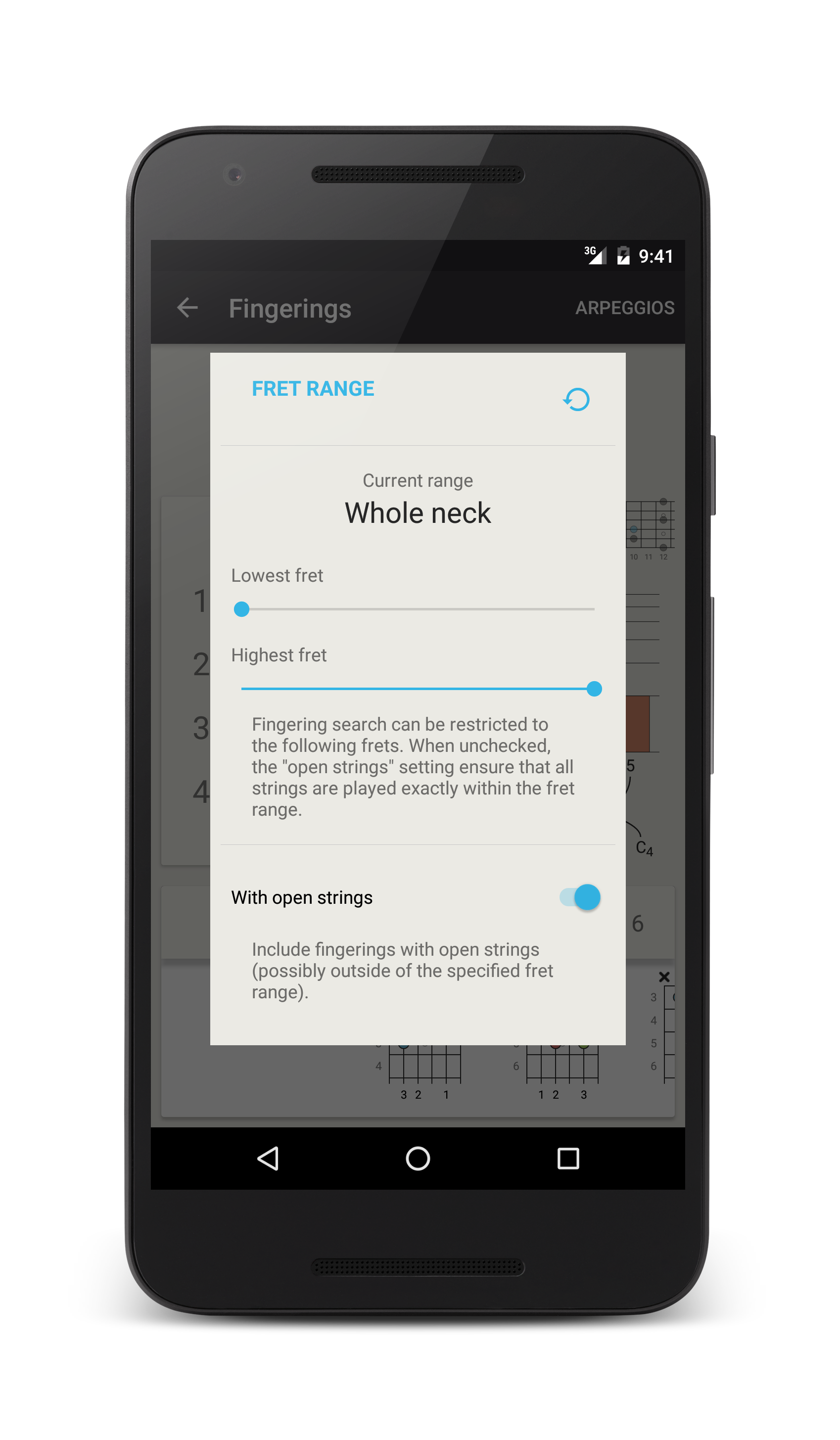 The same for fret range: you specify a low and a high fret and all the fingerings will be able to fit between these frets. Open strings can easily be included even if the low fret is higher than 0 (the nut), or you can tell the app to be strict and forbid open strings in this case.