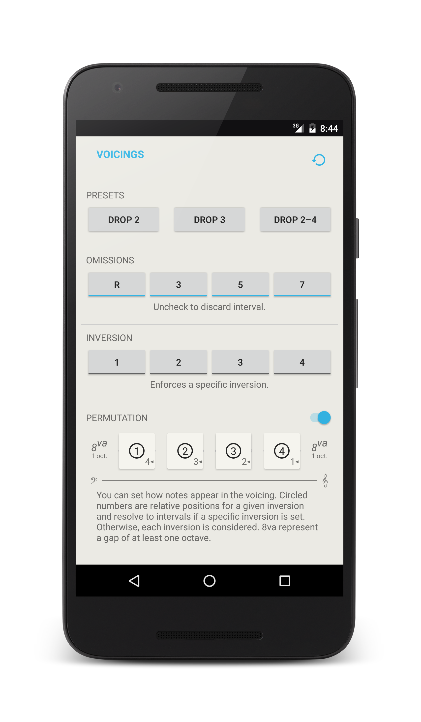 If you are still following, let’s tackle the tricky part: If no specific inversion is selected, the app will generate permutations corresponding to all inversions. In this case, the permutations are relative to the positions in the inversion, and not to the intervals. For example, for a 4 notes chords with no inversion, permutations are starting with [][① ② ③ ④][] and the app will generate all the inversions of a chord, with ① being replaced successively by R, then 3, etc, and ② by the interval following ① (so 3, then 5, etc.). Drop 2 voicing for 4 notes chords will then correspond to [][③ ① ② ④][] (the 2nd note from the end (③) was dropped of 1 octave and lands before ①). Thus, if no inversion is specified and for a dominant 7th chord, the app will consider voicings of the form 5 R 3 7, 7 3 5 R, R 5 7 3 and 3 7 R 5. If ever an inversion is selected, only the kind corresponding to the inversion will be generated, as stated above.