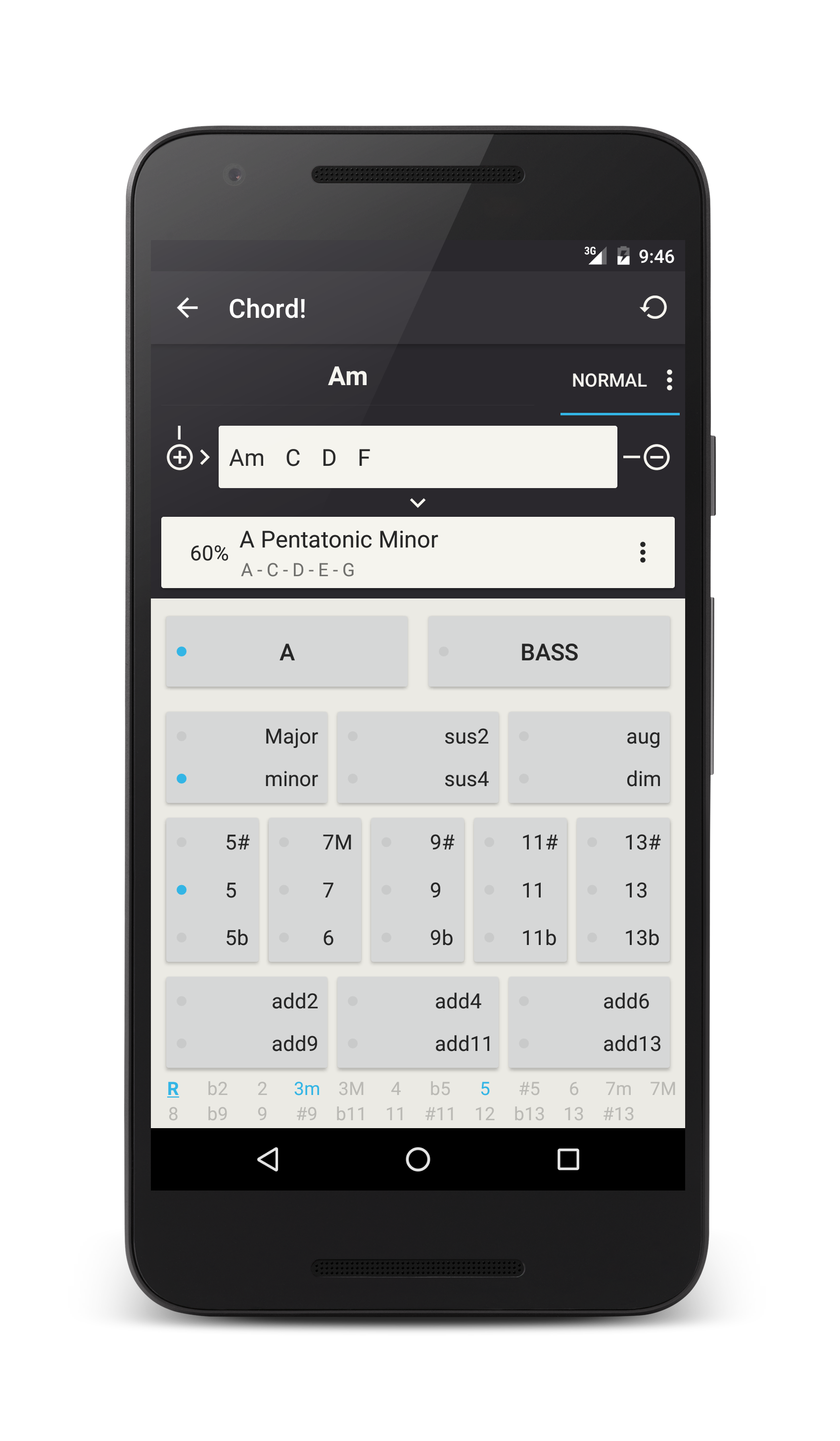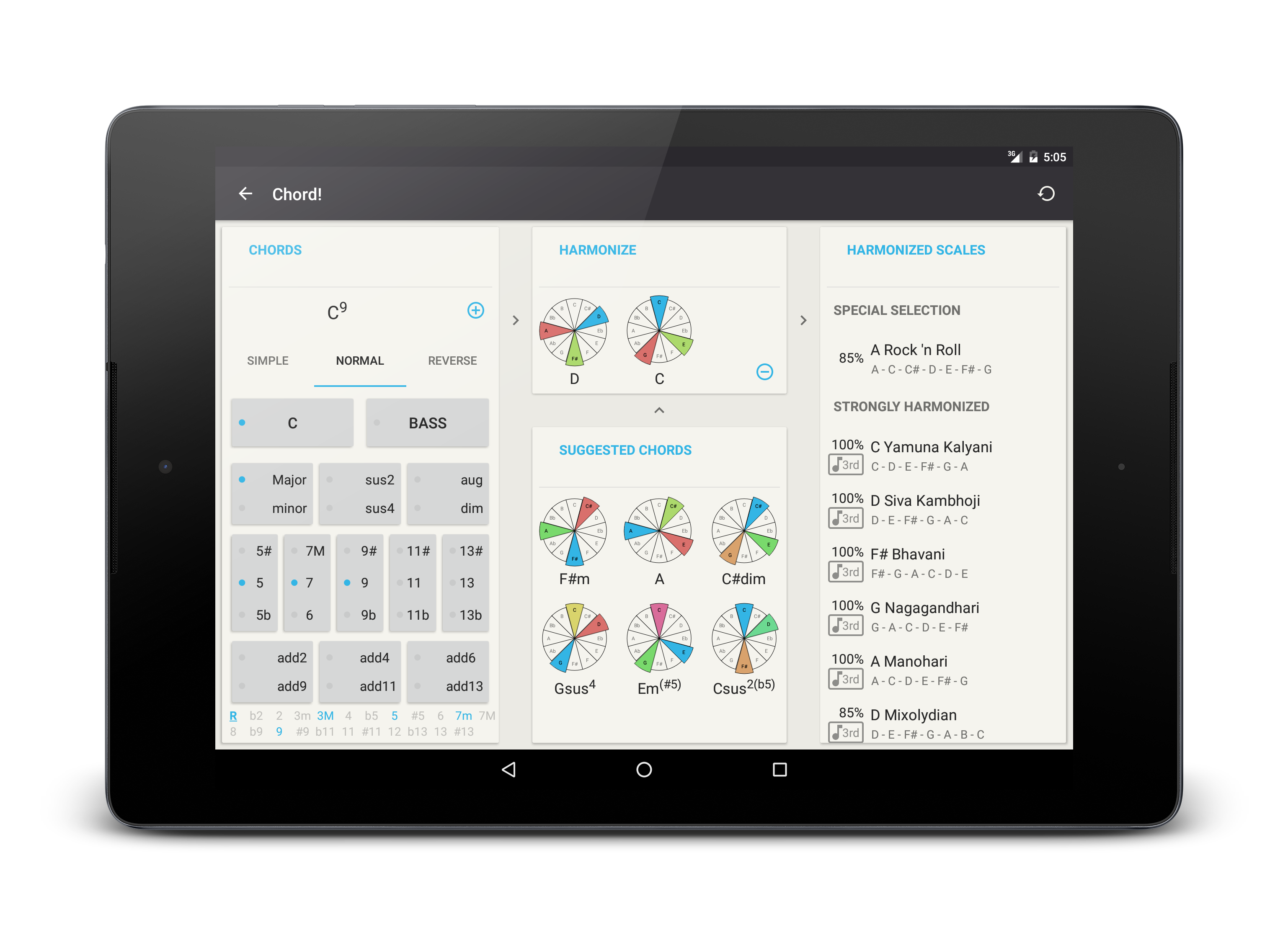 The app then proposes a set of scales that can go well when played along with chords from the set. Scales marked with the “Scale harmonization” symbol can effectively generate the chords of the set via standard scale harmonization (the harmonization step is specified too). The “Special selection” are scales that can more or less loosely match the set of chords, but are so ubiquitous that they sound well most of the time. This is usually the best choice to make.