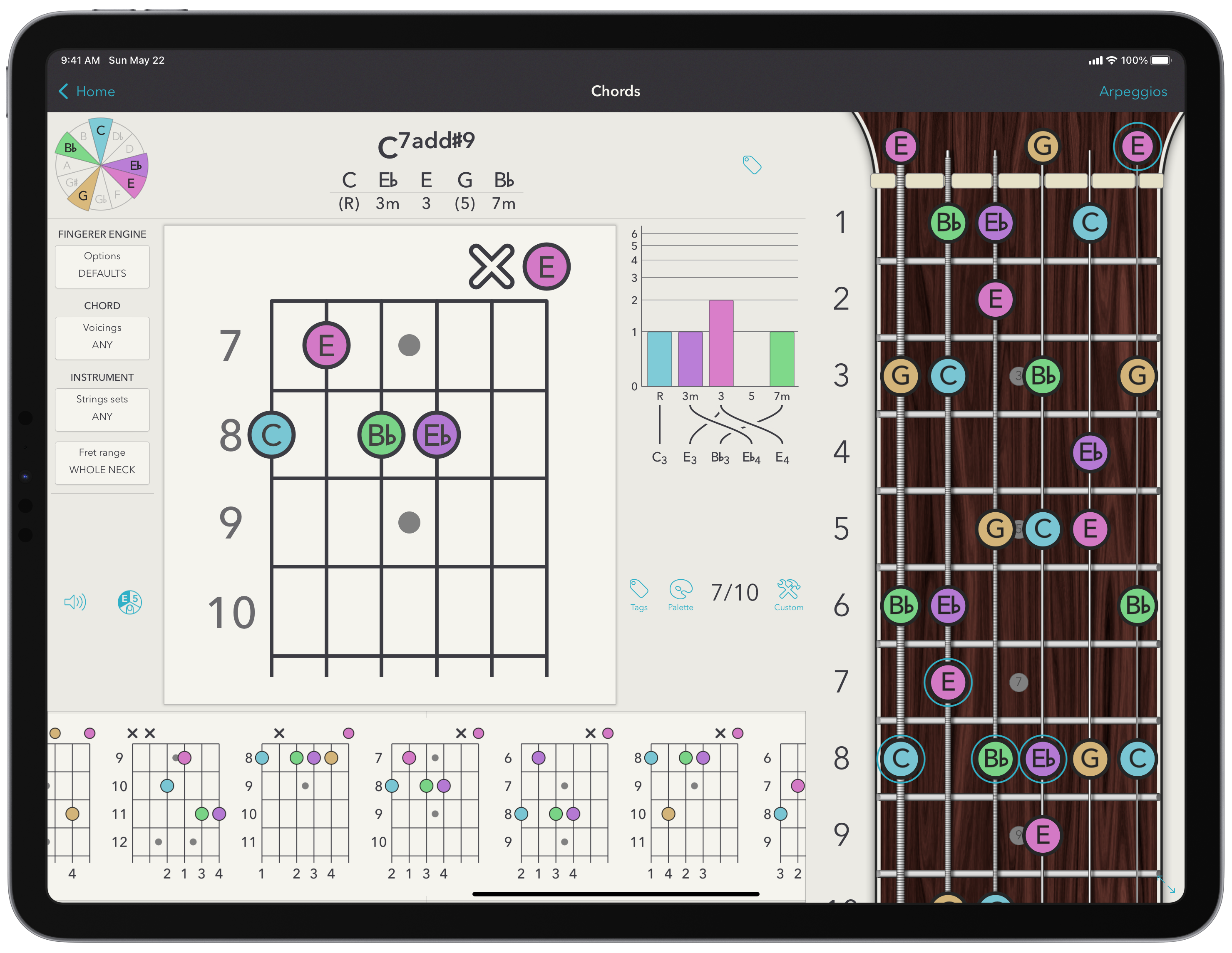 You can do several things with chords. Most likely, you’re looking for their fingerings, but you may want to extract some scales from some, or use them to write a song. It any case, you have to select some chords and the app propose several ways to do so.