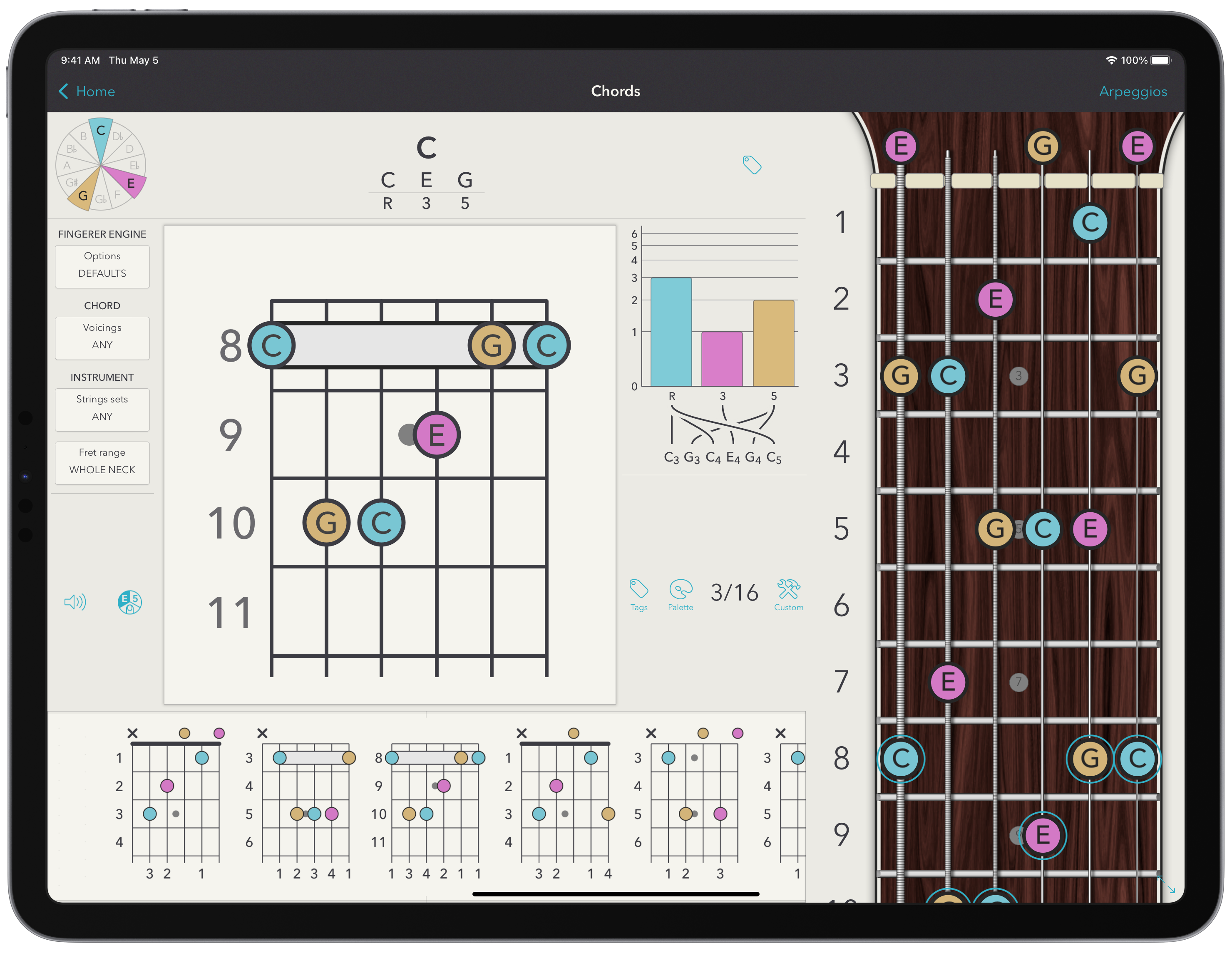All the views on the fingering screen are touchable and react to each other. You can swipe the main fingering to hear a preview. To its right is a chart corresponding to the dispatch of the fingering notes into intervals. You can quickly see which intervals are more represented, or which ones are missing. If you touch the chart, the corresponding notes on the fingering will highlight and you will hear a preview. On the iPad, you can further see a permutation diagram below the dispatch charts. It shows how the notes from the lowest sounding to the highest are ranked with respect to the intervals. This allows you to identify (but the app does this for you too) special permutations like drop 2 voicings for example. The permutation diagram is touchable too.