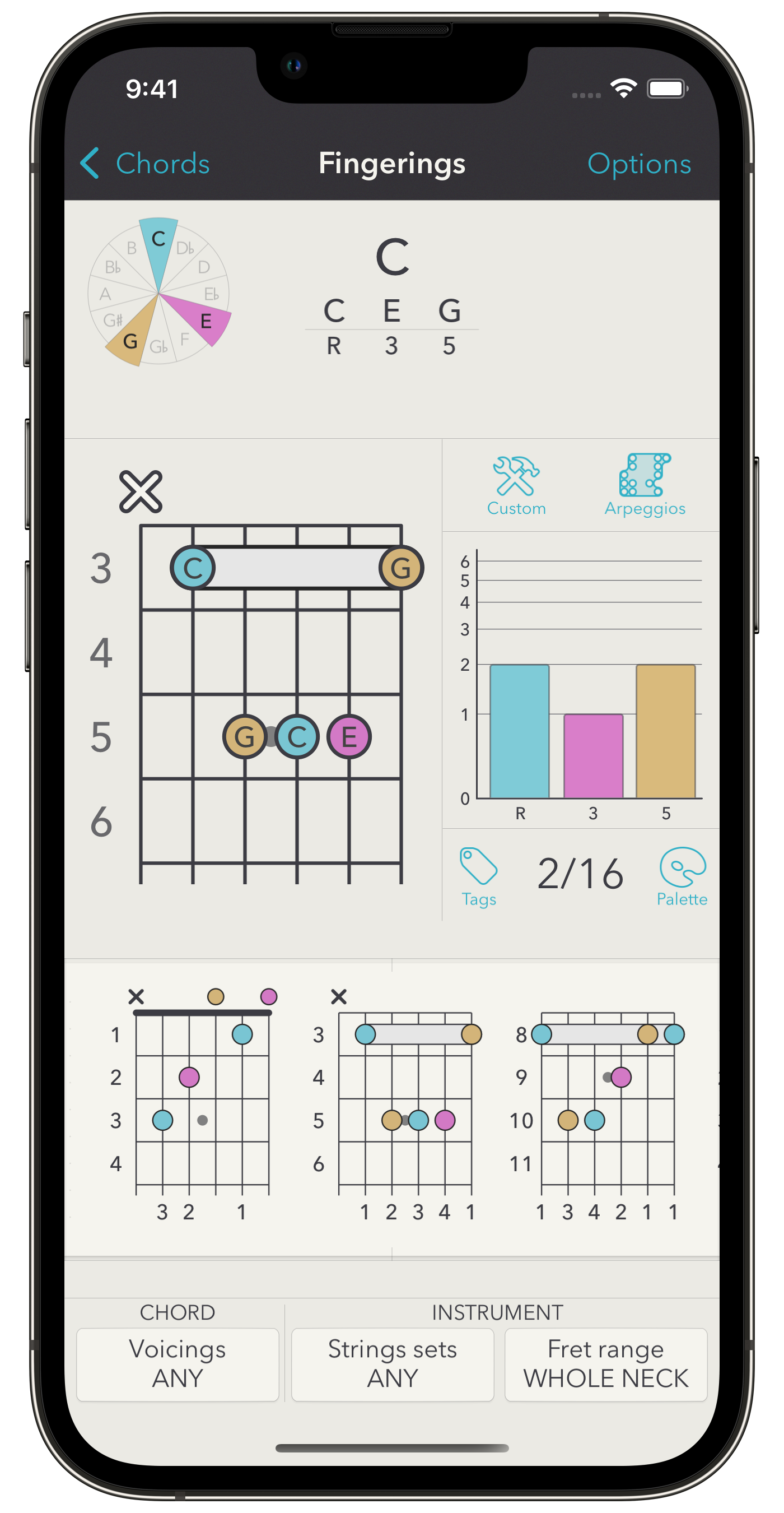 On the chord fingerings screen, you can refine fingerings in several ways. Use the Options button to override your current defaults (as defined in the Settings section of the app). This allows to quickly relax or tighten some properties on the case by case basis.