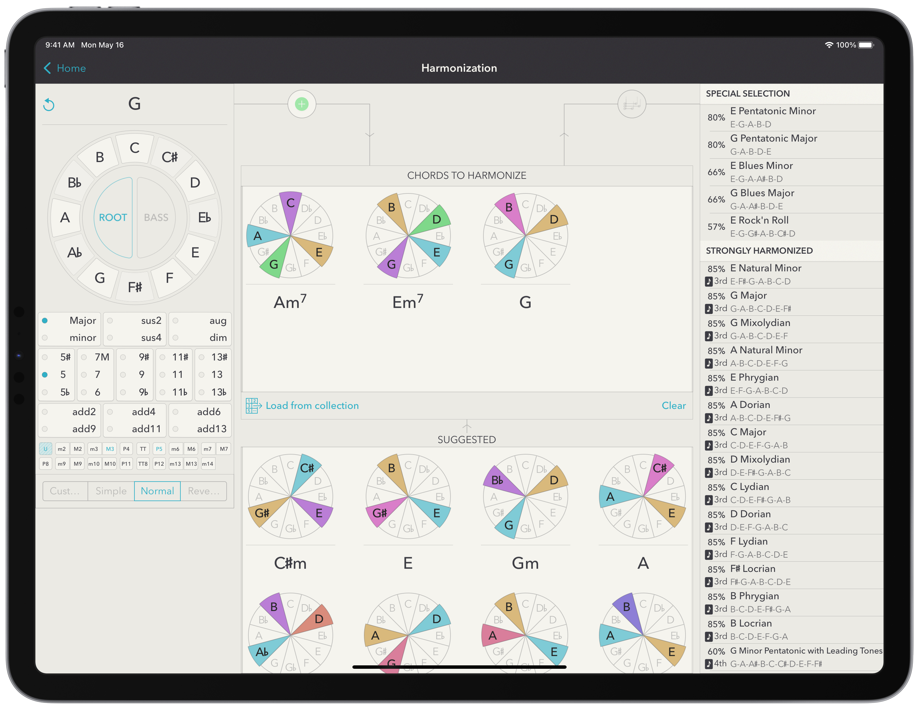The opposite direction consists in giving scales that correspond to a set of chords. As such, the order in which the chords appear in this set is not relevant. So the main task is to fill this set with chords. On the iPhone, from the home screen, either use the top left menu or go to the usual chord input screen and use the dropdown to select “Harmonization” instead of “Fingerings”. The top of the screen will change and the new interface allows to add or remove chords into the harmonization’s set. On the iPad, the Harmonization screen is reached with the “Harmonize” button linking the chords and the scales sections. On both devices, you can also load a collection of chords (or fingerings demoted as chords only) with the help of the “Load from collection” button. In such a case, the collection can be transposed on the fly before chords are added to the set. On the iPad, the app furthermore suggests chords based on several musical properties.